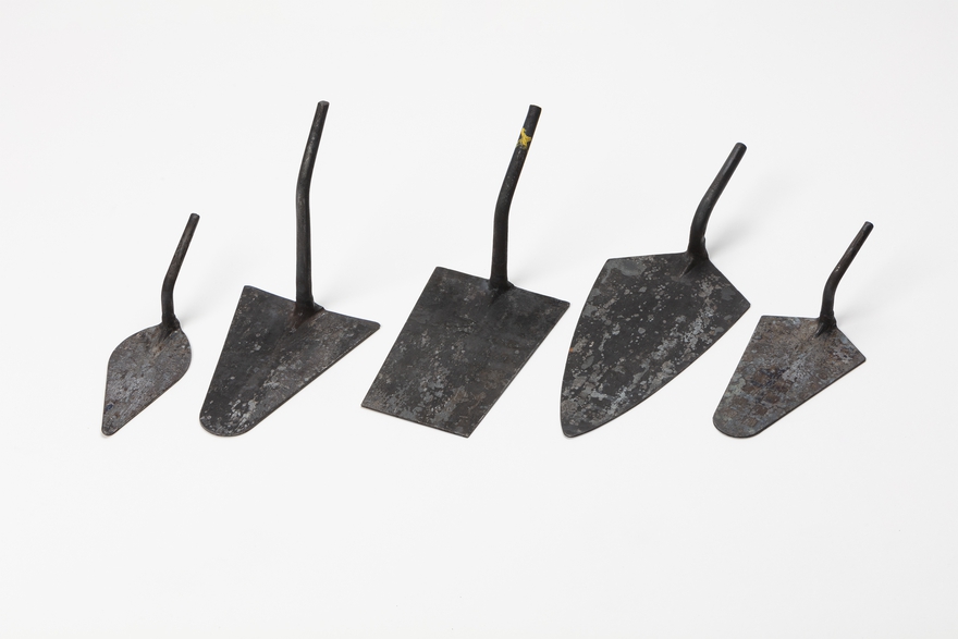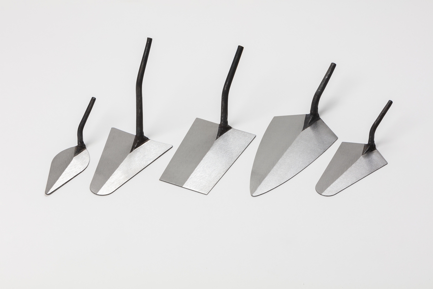 Different types of forged trowels and bricklayer pallets before the grinding process.