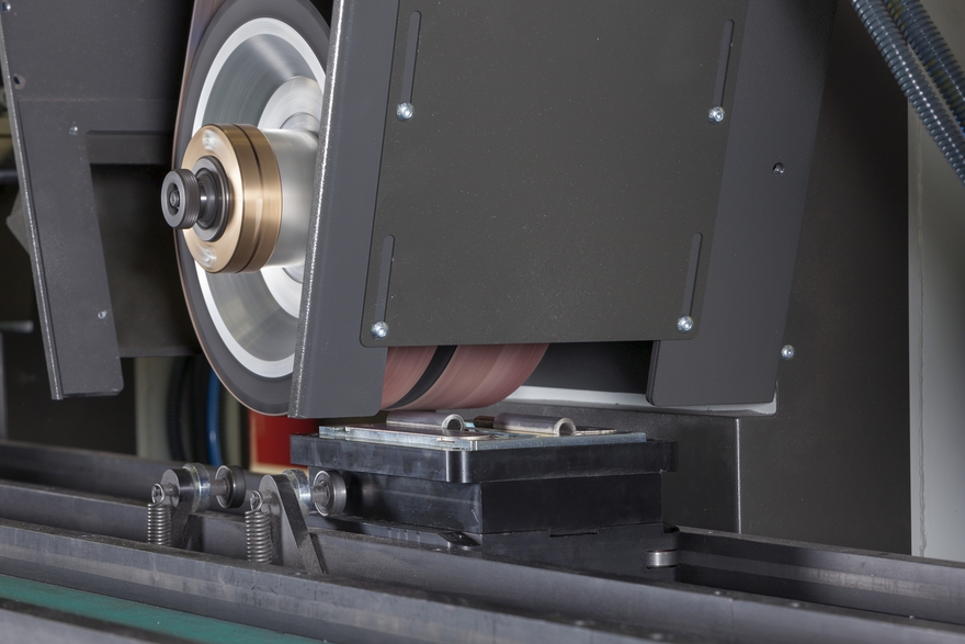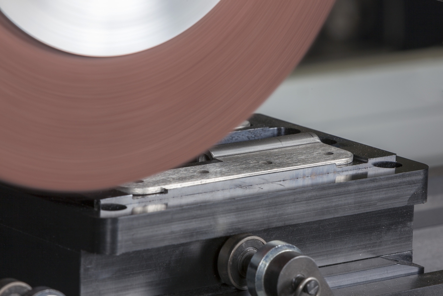 Máquina automática especial para lijar y satinar superficies planas.Tipos de piezas: bisagras de acero inoxidable, latón, etc.