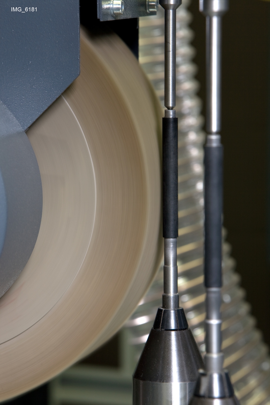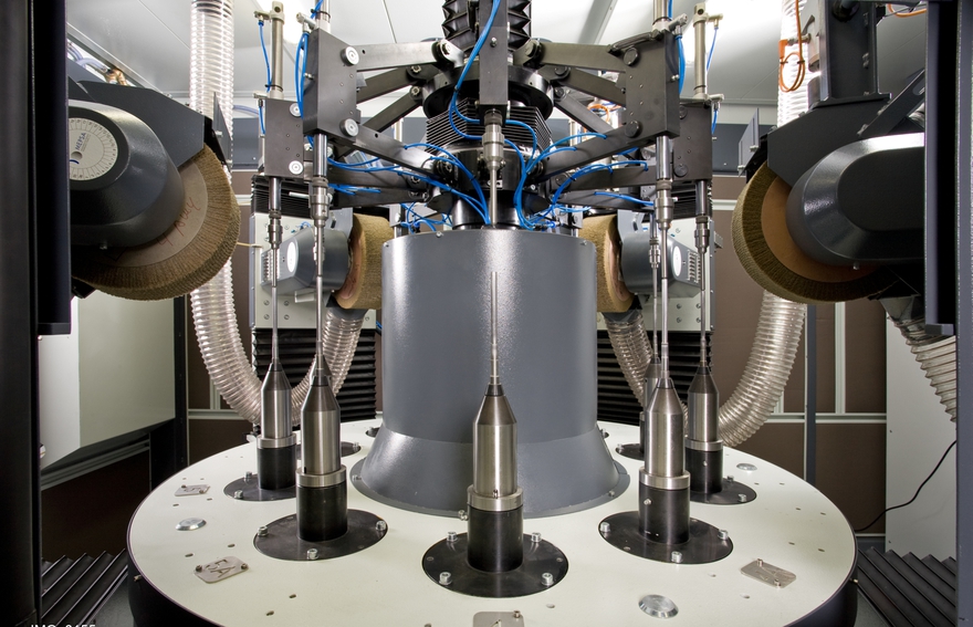Vista general de la mesa rotativa, unidades de pulir y sistema de sujeción por contrapunto automático y escamoteable.