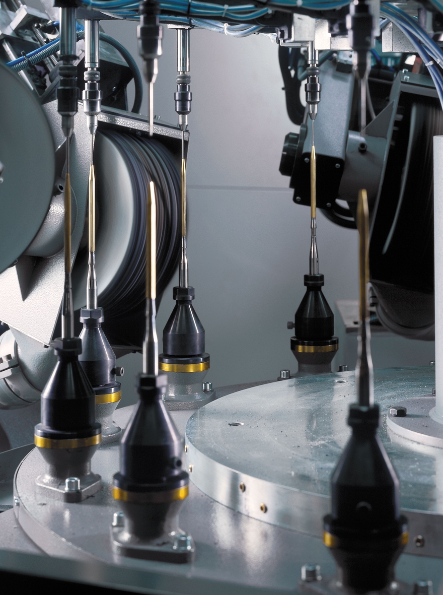 Layout con una mesa rotativa multi-husillos, de ciclo continuo, con seis unidades de pulir programables.