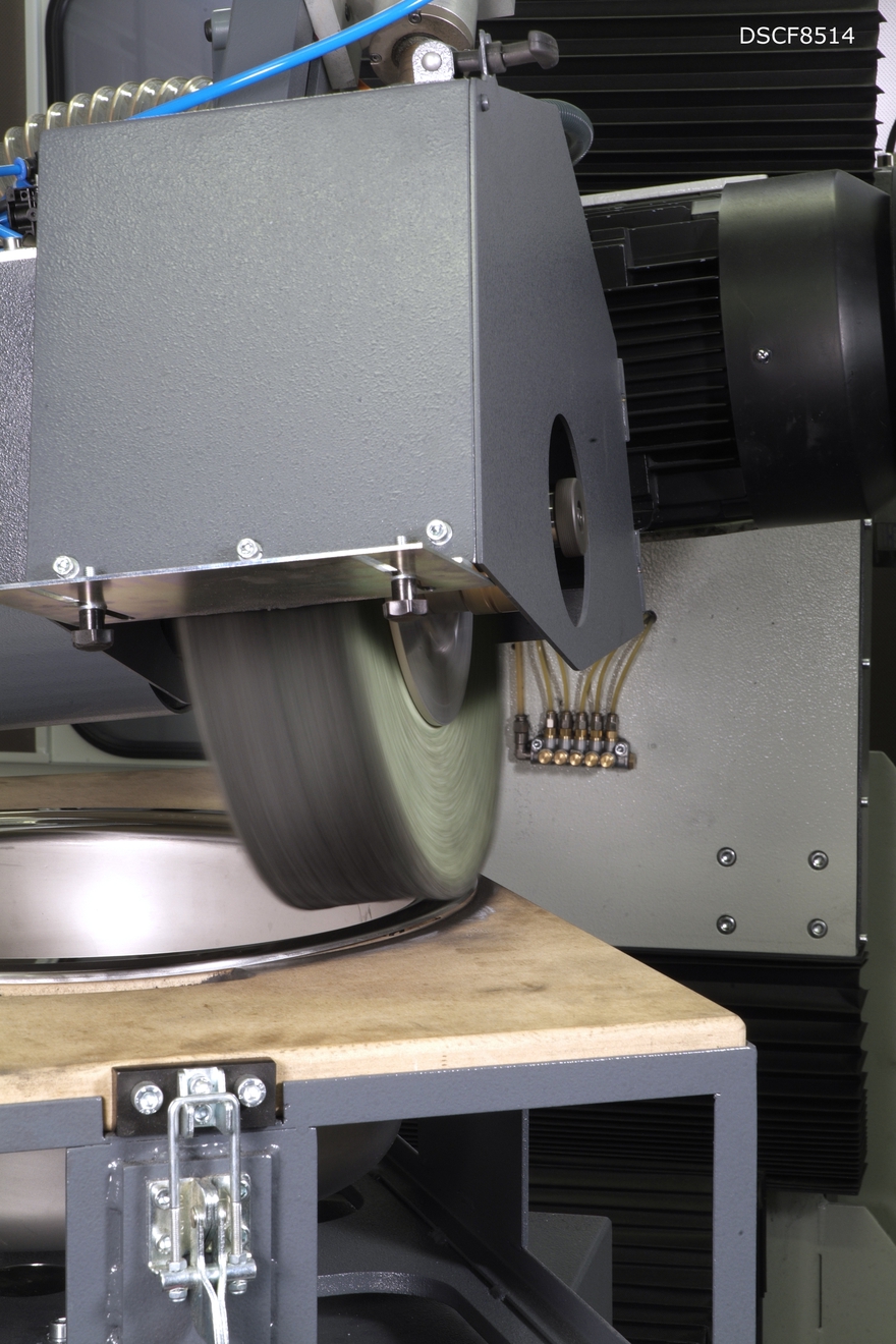 Máquina especial CNC para el satinado o pulido del contorno superior de fregaderos.Tipos de piezas: fregaderos de acero inoxidable redondos y rectangulares, con uno o dos senos.