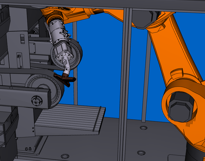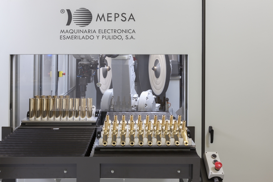 Célula robotizada para pulir y abrillantar cuerpos de grifería sanitaria.Tipos de piezas: Cuerpos de grifería sanitaria, accesorios de baño, herrajes, etc.