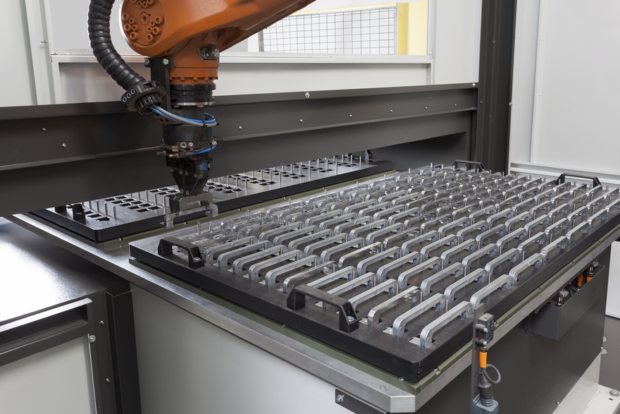 Célula robotizada para lijar y pulir piezas y accesorios para herrajes.Tipos de piezas: tiradores, manivelas, bisagras, inyección de zamak, etc.