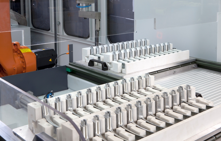 Célula robotizada para lijar manivelas y placas de herrajes.Célula básica con una unidad de lijar.