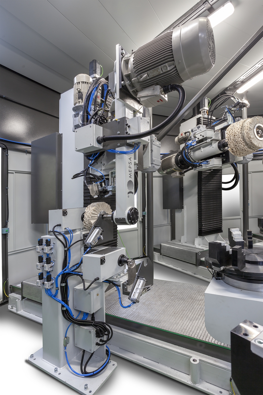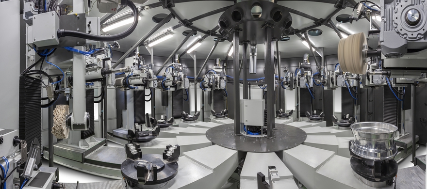 Configuración de la máquina adaptada a las necesidades del cliente. Vista general de la mesa rotativa y de las unidades de pulir.