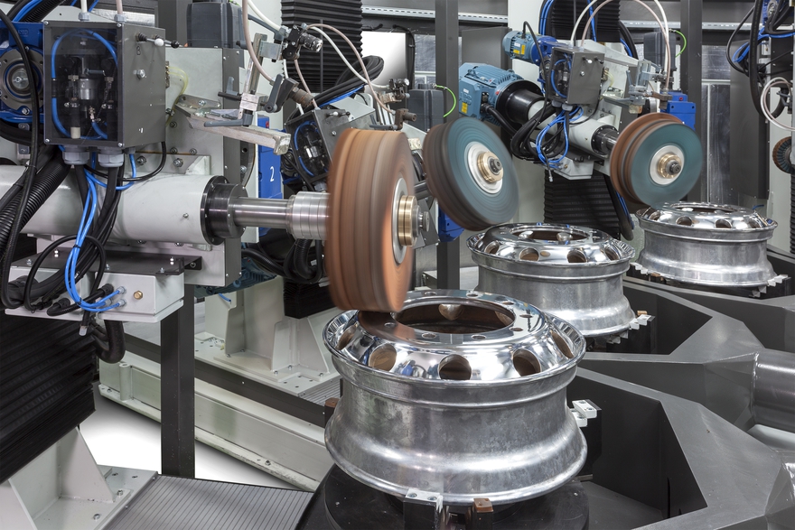Pulido exterior OD. Mesa rotativa indexada con doce estaciones de trabajo y diez unidades de pulir. Cuatro ejes de control numérico programables e interpolables en cada estación de trabajo. Una estación con automatismo para voltear la llanta.