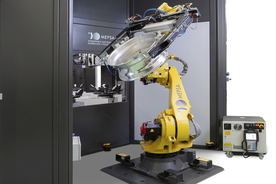 Pulido interior ID. Mesa rotativa indexada con catorce estaciones de trabajo y doce unidades de pulir. Cuatro ejes de control numérico programables e interpolables en cada estación de trabajo. Una estación con automatismo para voltear la llanta.