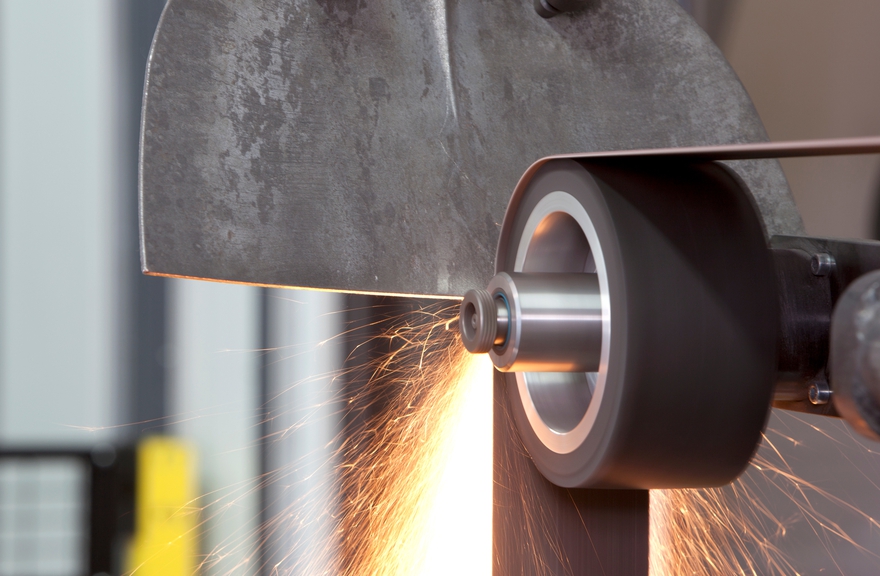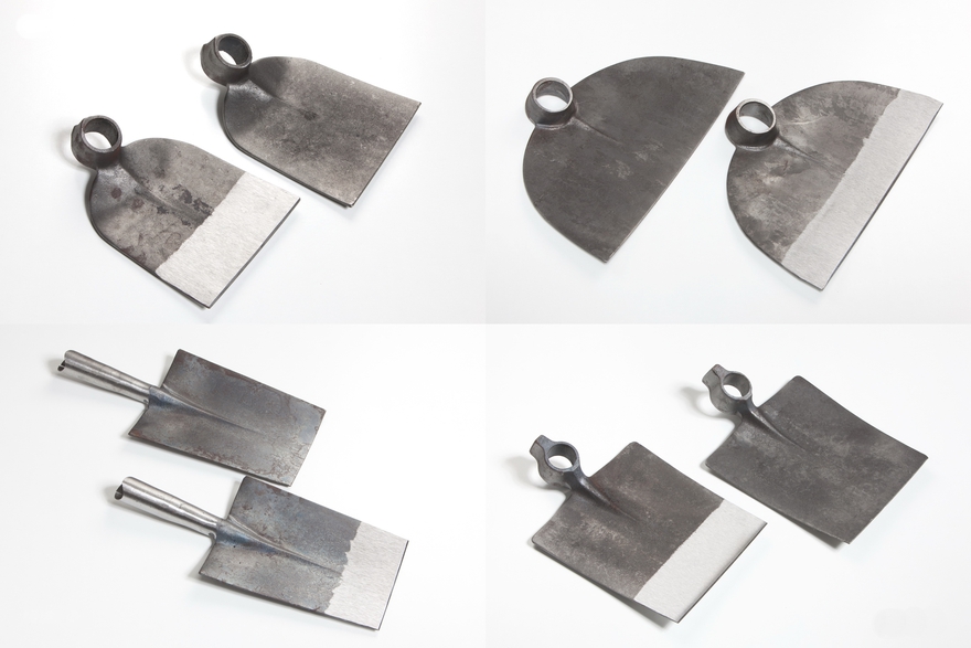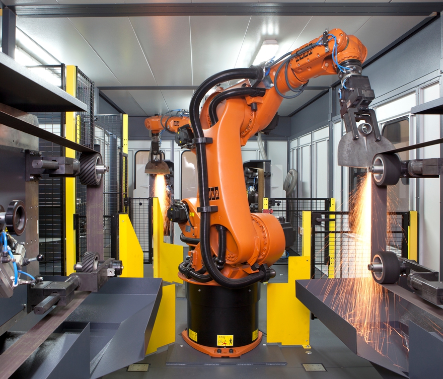 Célula robotizada especial para lijar azadas y otras herramientas de forja para la agricultura.Célula con 2 robots industriales.