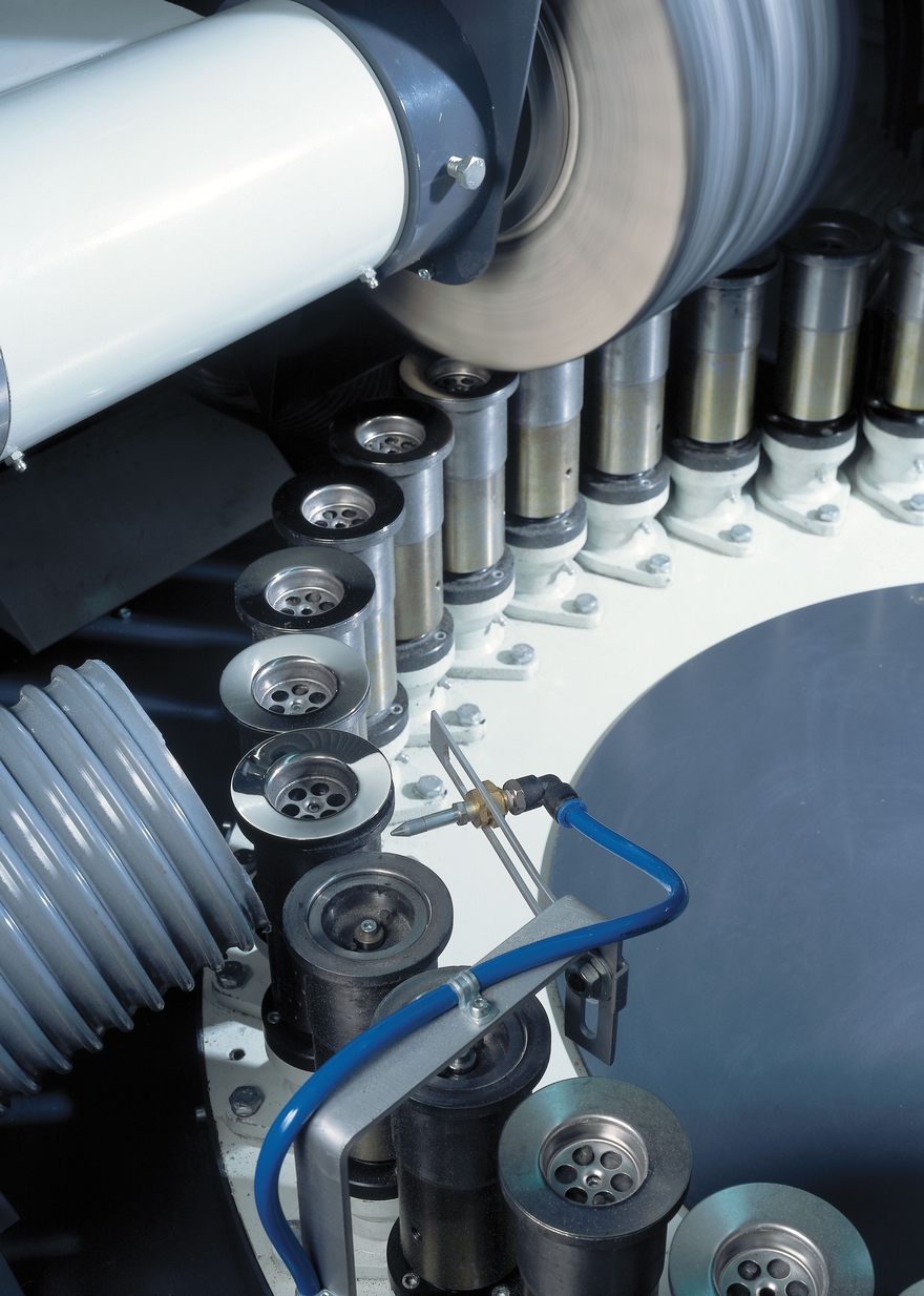 Layout con una mesa rotativa multi-husillos, de ciclo continuo, con tres o cuatro unidades de pulir.