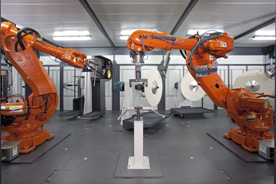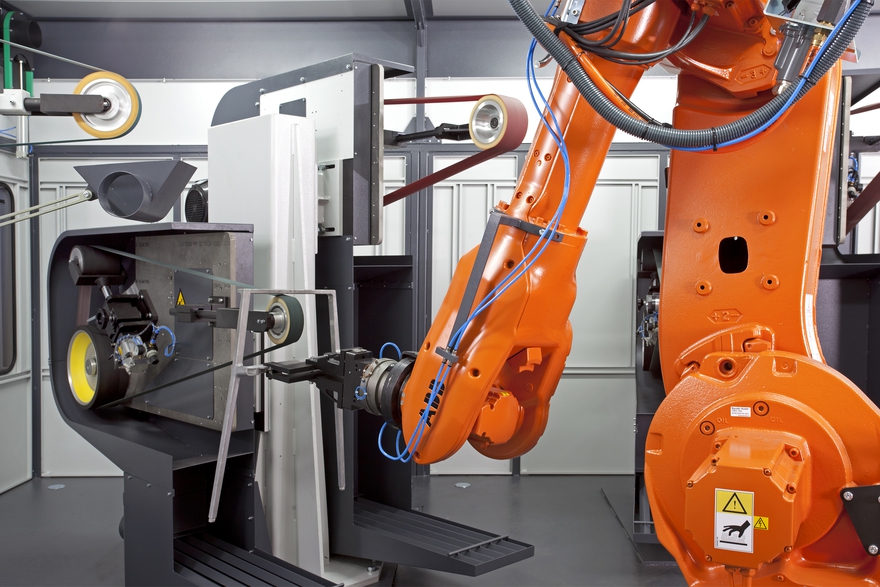 Disposition avec deux robots et un total de 10 unités de ponçage et de polissage d’exécution spéciale.