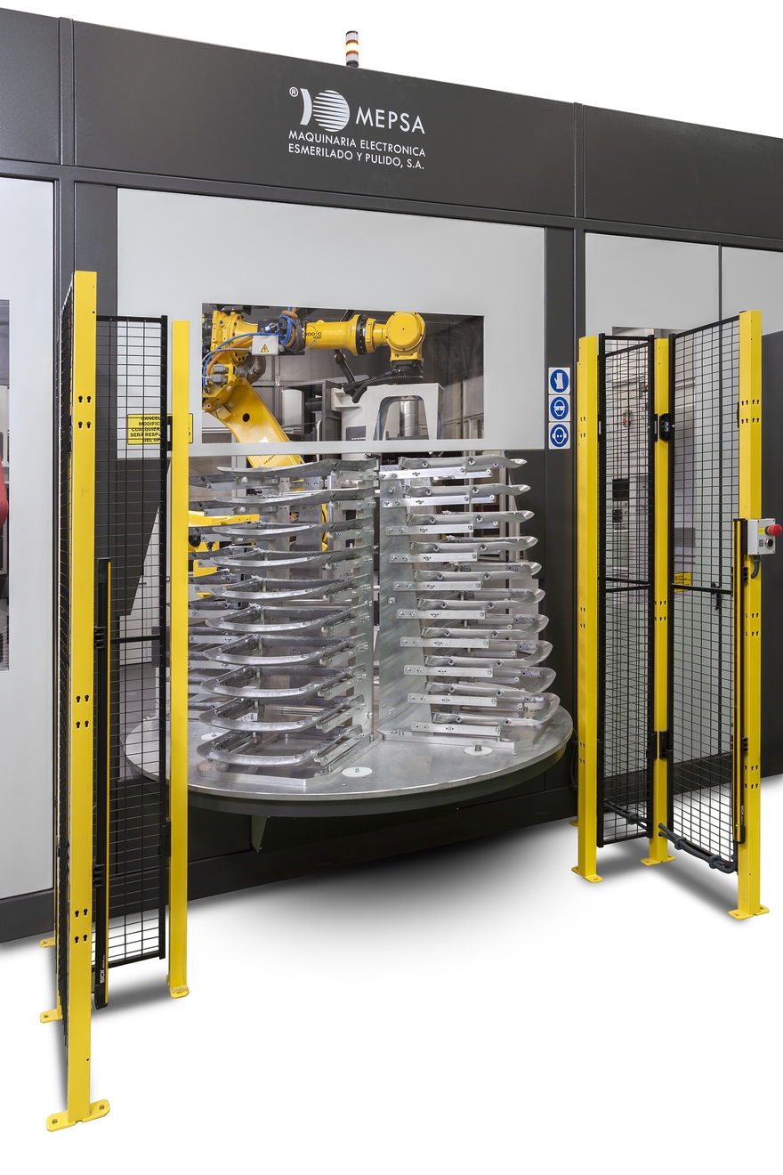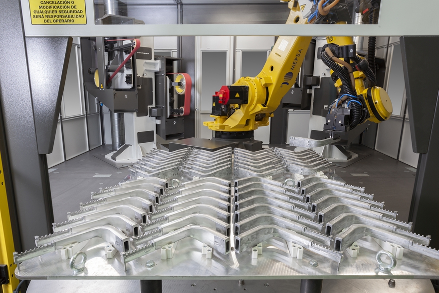 Célula robotizada especial para lixar e rebarbar peças de alumínio injectado para móveis de escritório.Tipos de peças: bases de cadeira, encosto, apoia braços, etc.